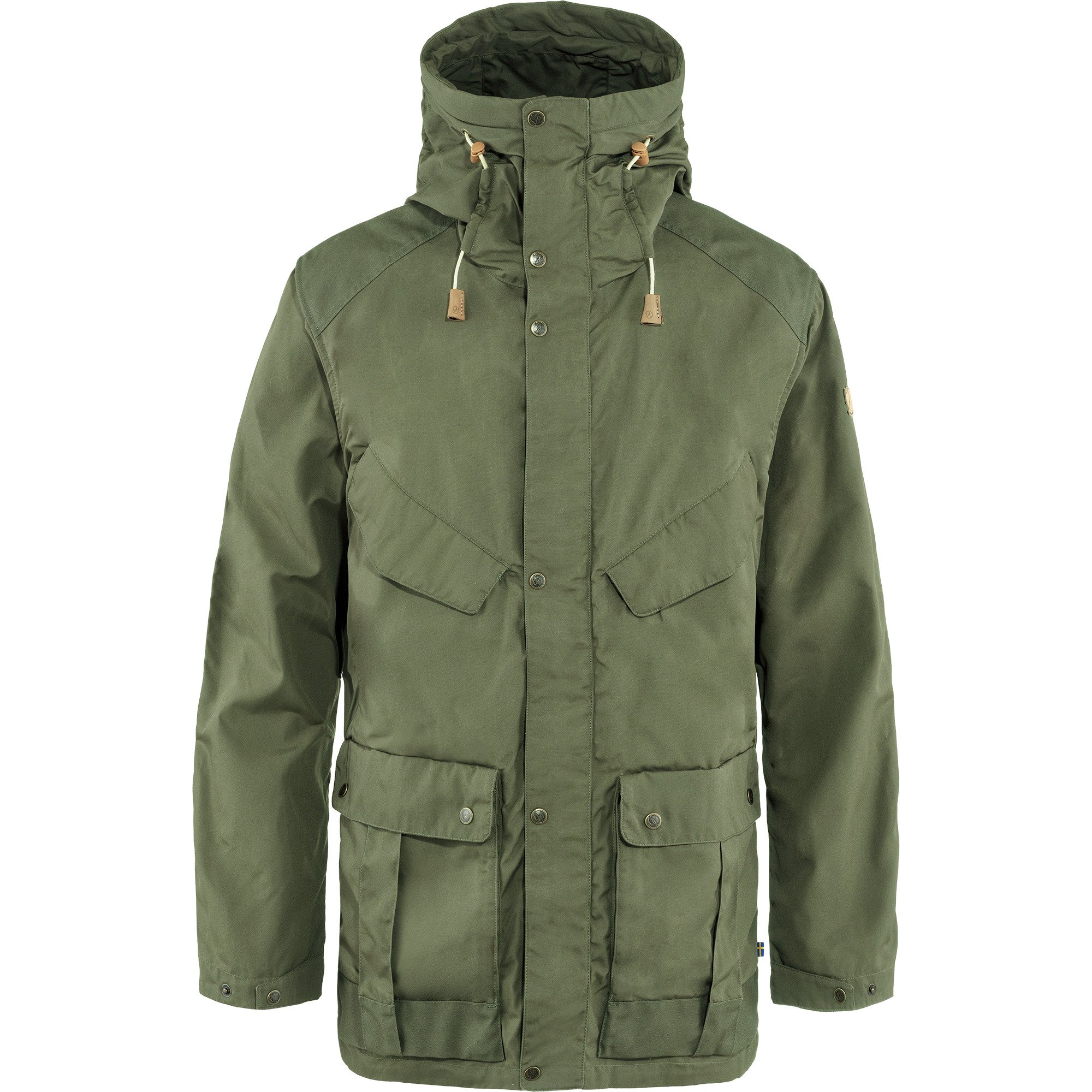 Durable outdoor jacket with well thought-out functions for demanding treks all four seasons of the year. The hood can be adjusted for a perfect fit around the head, and a visor construction means that you can fold the visor back from two angles, depending on whether you want maximum wind protection or more peripheral visibility. When not being worn, the hood forms a high collar that keeps your neck warm. Plenty of storage for a map, GPS, two-way radio and other necessities in the two diagonal breast pockets with flaps, two large bellow pockets at the hem and two pockets in the back. There are also two inner pockets, of which one is zippered. Extra fabric at the armpits and bellow pleat at the back provide excellent mobility. Buttoned sleeve cuffs. The jacket is made from wind and water-resistant G-1000 in recycled polyester and organic cotton with extra strong G-1000 HeavyDuty at the shoulders, sleeves and pockets. The fabric and details were chosen to minimise their impact on the environment - for example most of the leather details are made from leftover pieces of leather - and to make it easy to replace exposed sections after years of use. Article number: F83241 Gender: Men’s Family: Numbers Activity: Trekking Environmental info: Organic cotton, Recycled polyester Features: Adaptable with Greenland Wax, Breathable, Durable, Water resistant, Wind resistant Product Features