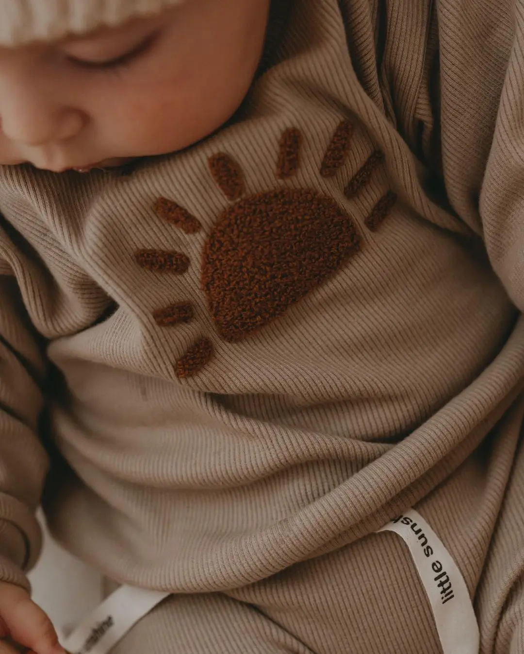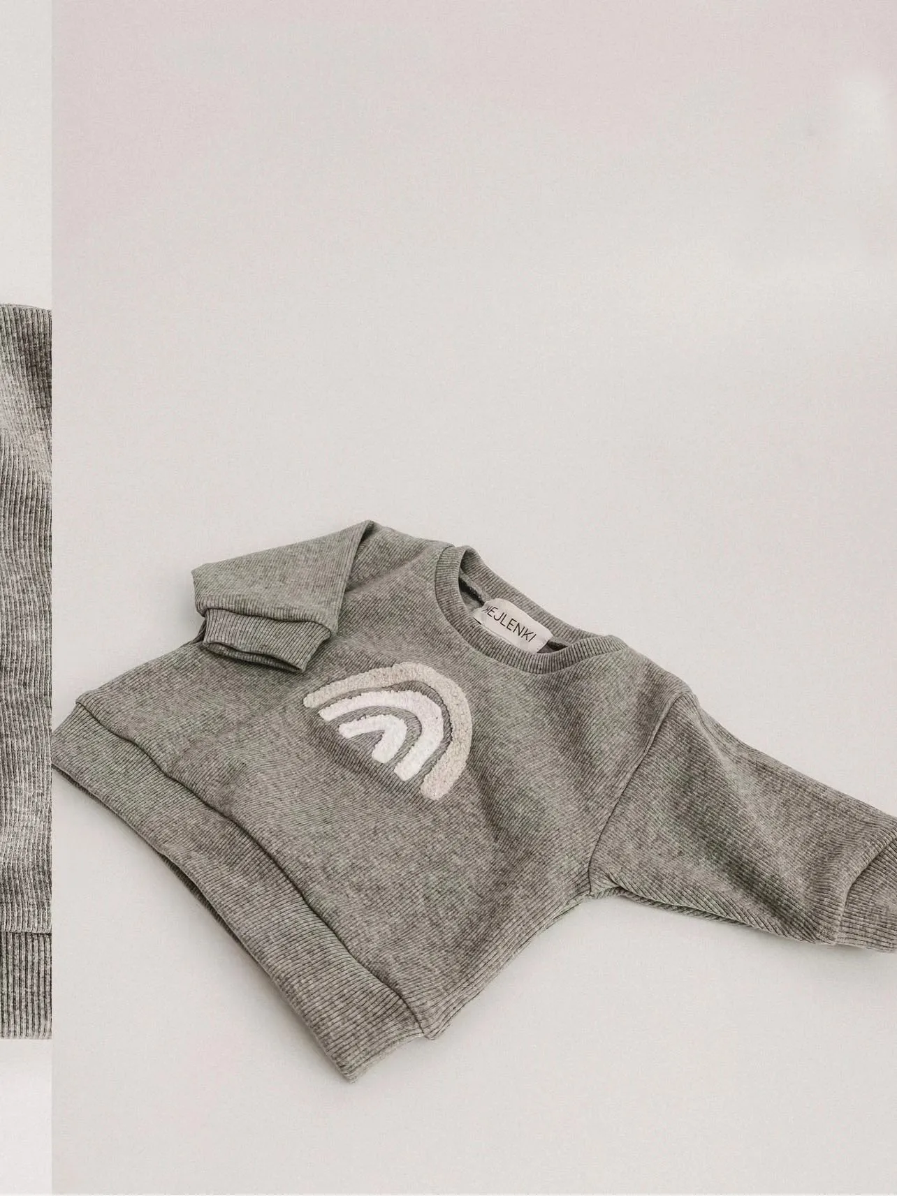 It features an embroidered rainbow design at the front and a matching elastic waist comfy pants. These outfits are perfect for any activity, from playing in the park with friends to riding a family bike ride.