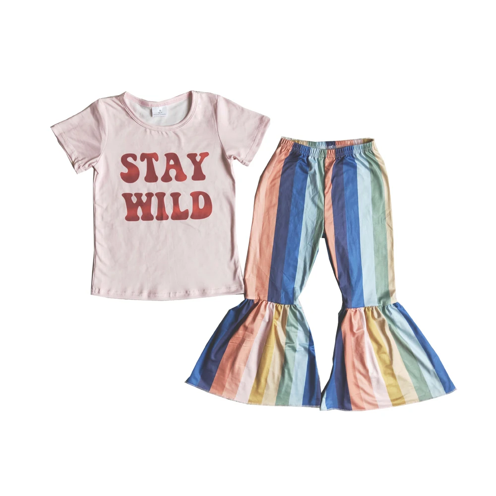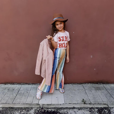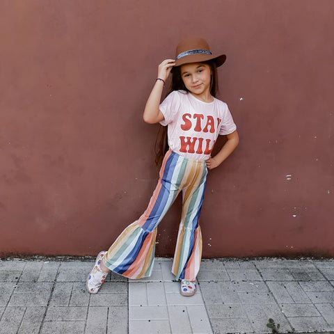Bring it back the retro vibes. Let your kids wear this stylish outfit that features a statement shirt and colorful vertical stripes with flare style at the bottom. It has retro-inspired because of its pants style. It is made of cotton and lightweight material. Perfect for any party or even casual occasion. Let your kids feel the retro-modern vibes on the groove. Add a chic ankle bootie and a wool coat for a winter-approved ensemble.